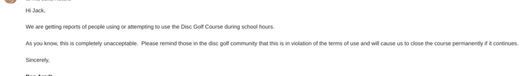 Taken at their word, the district agrees with the value the course brings the community and wants it open. They have told me they won’t shut it down for a single rule violation. But after that, it gets kinda vague, and that concerns me.